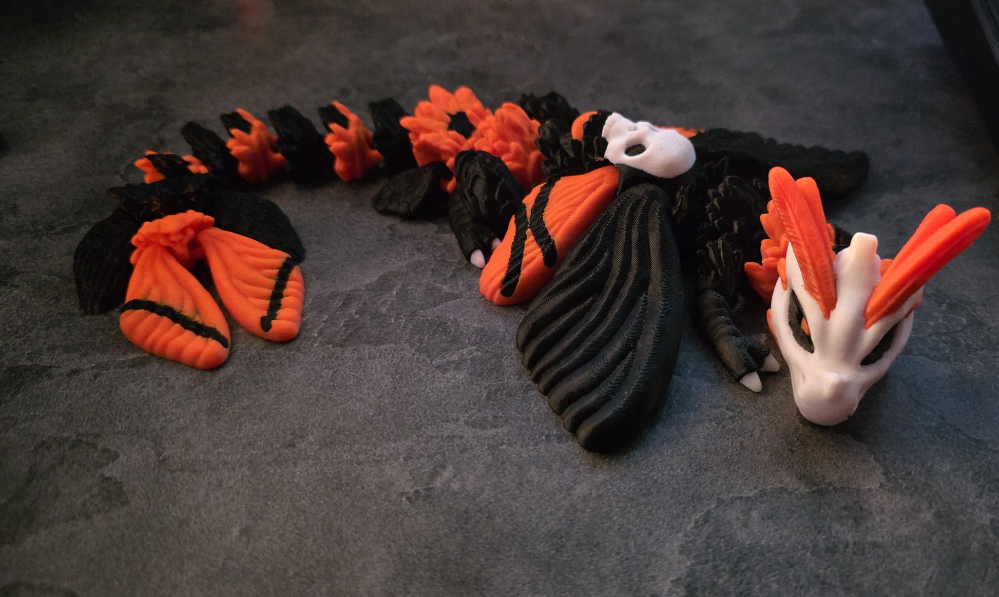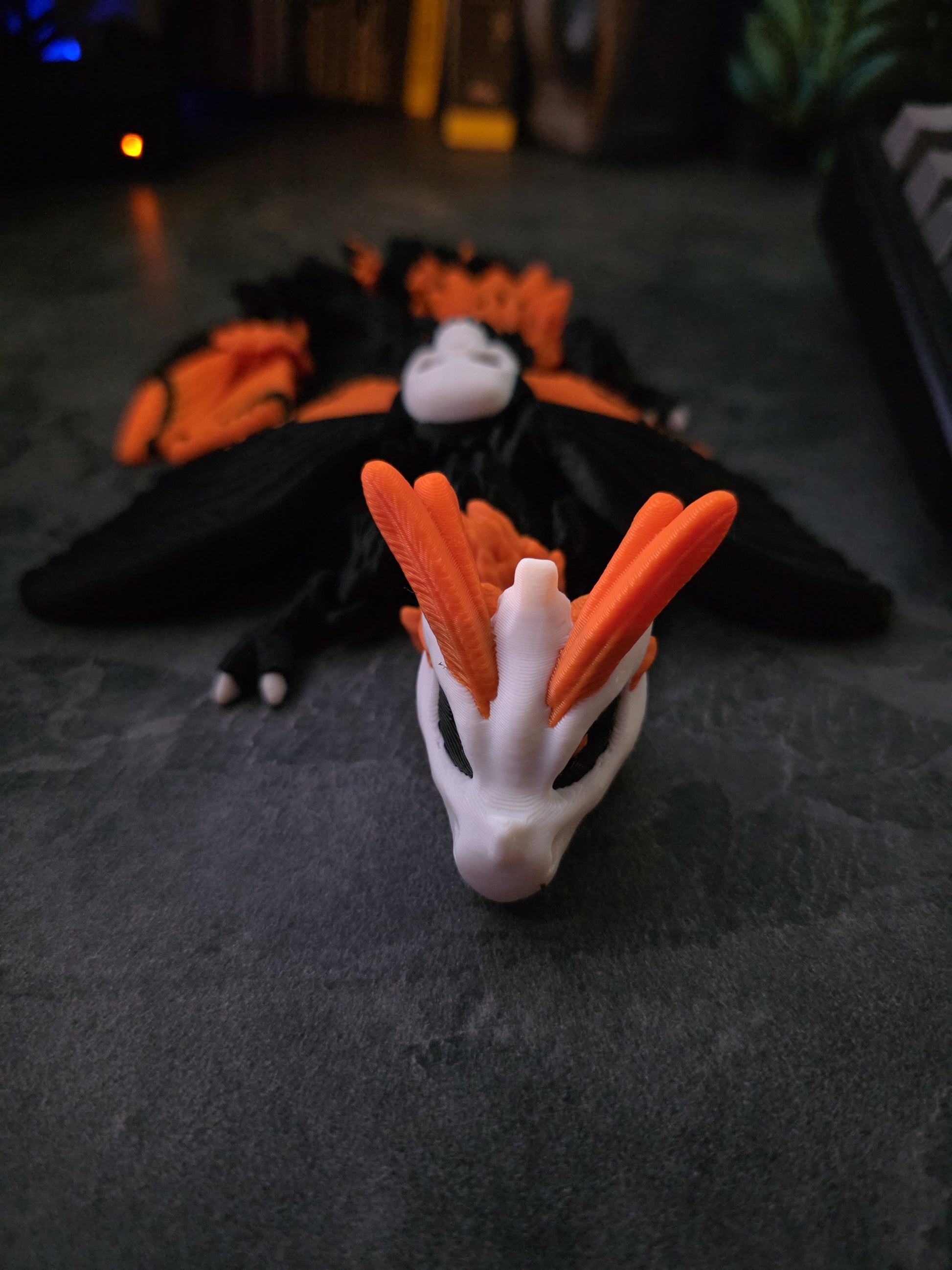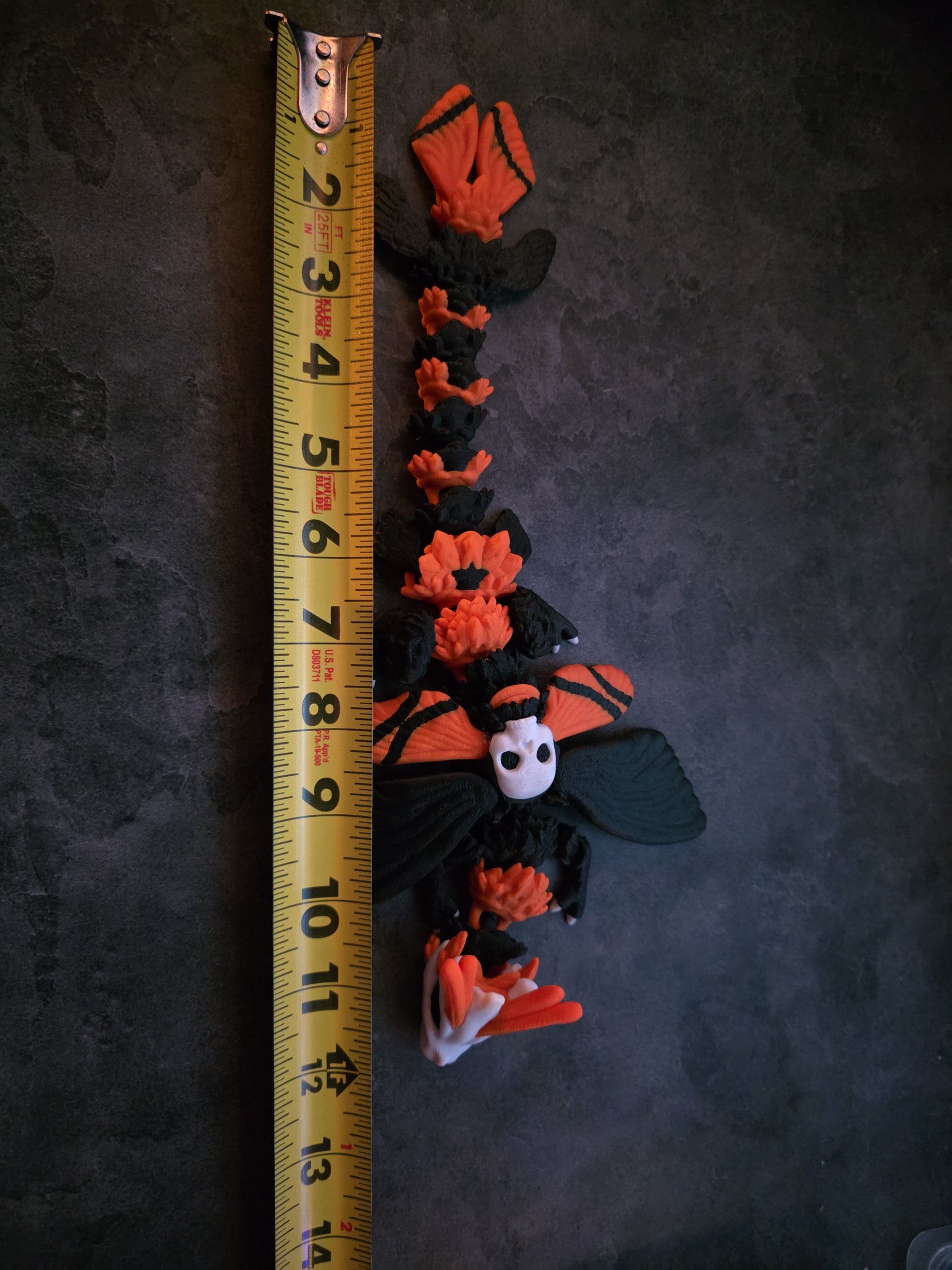 Inspired by the iconic Death Head moth, this articulated dragon features a skull-like visage, dark winged form, and bold ember accents. Designed as a collectible display piece, it balances eerie symbolism with detailed craftsmanship.